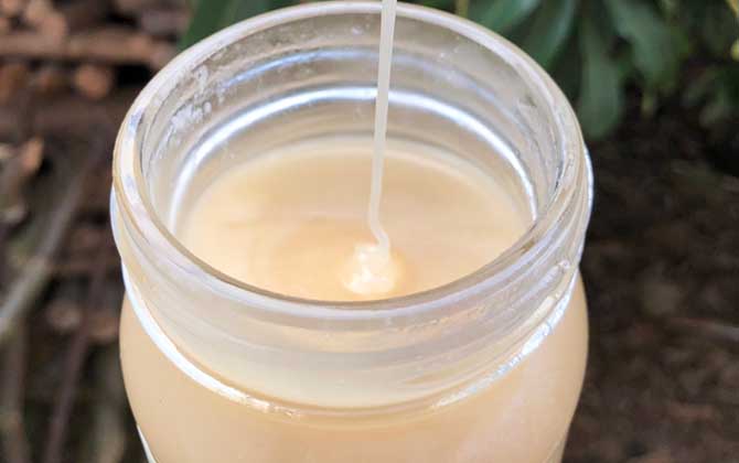 鸭脚木蜜未结晶时呈质地浓稠、透明且有光泽的浅琥珀色,有鸭脚木花特有的芬芳香味,口感甜润适口并略有淡淡的微酸味和轻微的苦涩味,回味有清爽自然的鸭脚木花香,易结晶,结晶后呈乳白色的细颗粒状,若与这些特征不同很可能是假鸭脚木蜜。