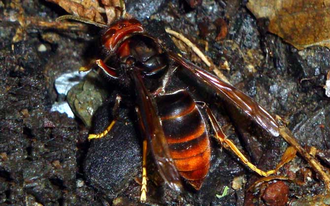 金环胡蜂是世界上体型最大的胡蜂,同时也是世界五大毒蜂之一,别称中国大虎头蜂,体长可达40毫米,少数几只金环胡蜂同时蛰刺就可致人死亡,被金环胡蜂蛰轻者将剧烈疼痛、红肿并逐渐向四周蔓延,严重时可引起心律失常、急性肾衰竭、过敏性休克甚至死亡。