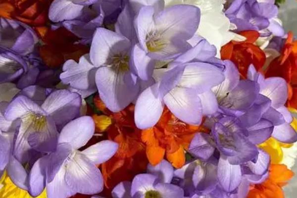 1、小苍兰一球可以开出两三串花朵,花朵颜色有紫色、黄色以及粉色、绿色,花型较大。