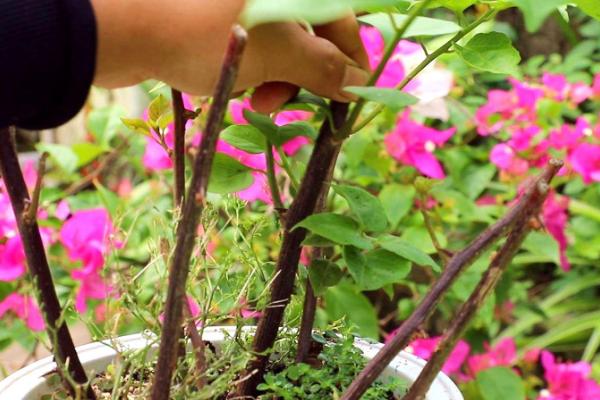 在对三角梅插枝时,需要选择生长粗壮、未遭受病虫害且带有芽眼的枝条,然后将其底部修剪成斜口状后,插入事先准备好的基土中即可,在插枝后可以向土壤中喷洒多菌灵溶液,防止土壤中滋生细菌,影响枝条适应环境。