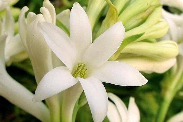 花朵:晚香玉的顶端长有花序,每个苞片里面含有数朵花,苞片呈绿色,花朵呈乳白色,开花后会散发出浓郁的香味。