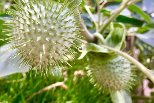 3、毛曼陀罗蒴果俯垂,形状为近球状或卵球状,直径3-4厘米,果子表面密生细针刺,针刺有韧曲性,而且毛曼陀罗全果亦密生白色柔毛,果实成熟后为淡褐色,由近顶端不规则开裂。