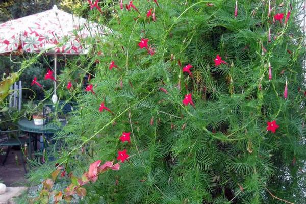 茑萝花为藤本花卉,随着植株幼苗的生长,及时用细线绳牵引,或用细竹片扎成各式排架,使茑萝花的藤蔓缠绕在支架上,不断向上攀爬蔓延生长,提高植株的观赏价值。
