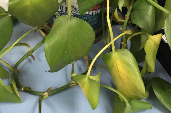 虽然绿萝比较耐阴,但长时间将绿萝摆放在阴暗的地方,不仅长势不好,叶片还容易发黄。此时需要适当增加光照时间,可有效缓解黄叶症,冬季的光照比较柔和,可给予全日照,也有利于绿萝越冬。