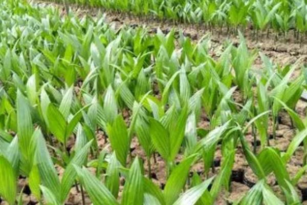 2、如果是使用化肥,在第一片真叶展开,土壤湿润时,在槟榔苗的侧边每株施加2g硫酸铵,到了4-5叶期,在槟榔苗的四周每株施加4g的硫酸铵。