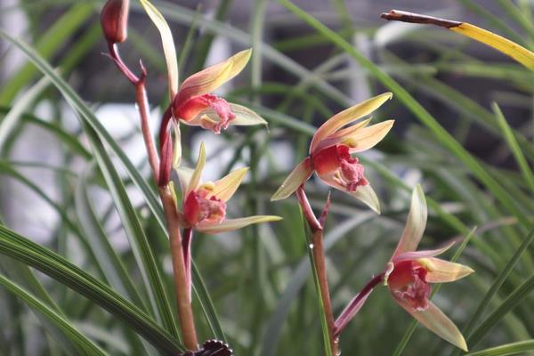 蕙兰开红花时,叶腋下方是花朵的主要生长部位,花朵长25-80厘米左右。