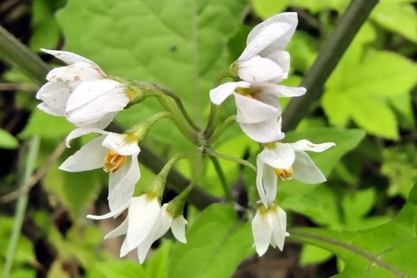 2、龙葵花的茎直立,有棱角,叶互生,呈卵形,基部宽楔形或近截形,先端尖或长尖,花朵为白色,萼片为卵状三角形,伞状花序侧生,花柄下垂。