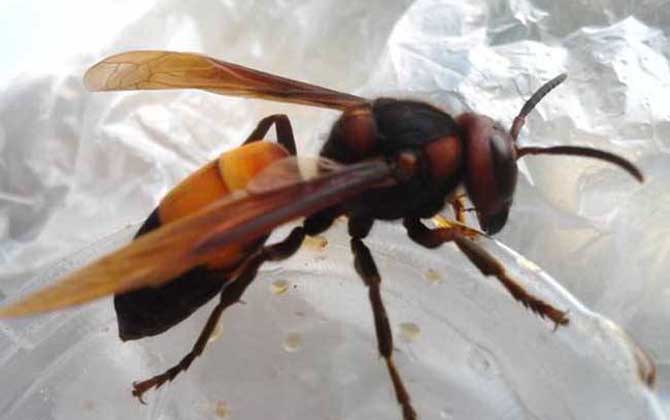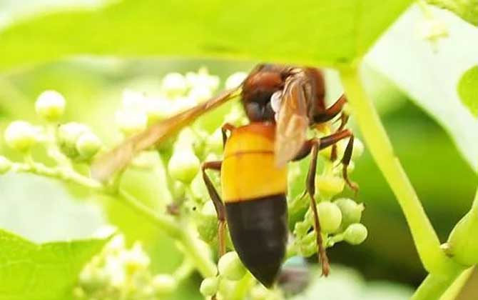 2、食性:黄腰虎头蜂是杂食偏肉食性昆虫,主要以各种昆虫及幼虫为食,也采食植物蜜腺分泌的含糖液体和成熟的果实,在食物匮乏的季节常集中捕杀蜜蜂及其他群势小的胡蜂。