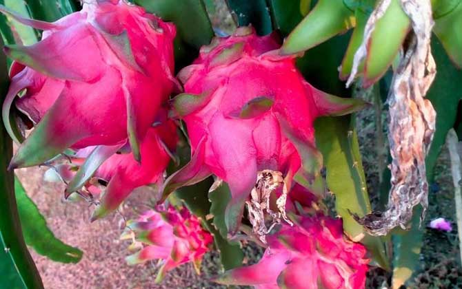 3、施肥:火龙果生长量比常规果树小,施肥要以充足、少量、多次为原则;其中幼树(1~2年生)以氮肥为主,做到薄施勤施,促进树体生长;成树以磷、钾肥为主,控制氮肥的施用量。